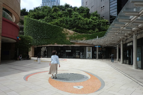 なんばスカイオビル2階部分から、大相撲3月場所のある体育館の方からなんばPARKSの回廊にあがります。前方に緑の木立が見えますが、まず足元に注意してください。ホームベースとピッチャープレートが、かたどってあります。実はここは「南海ホークス」のホームグランドの「大阪スタジアム」があったが場所なのです。